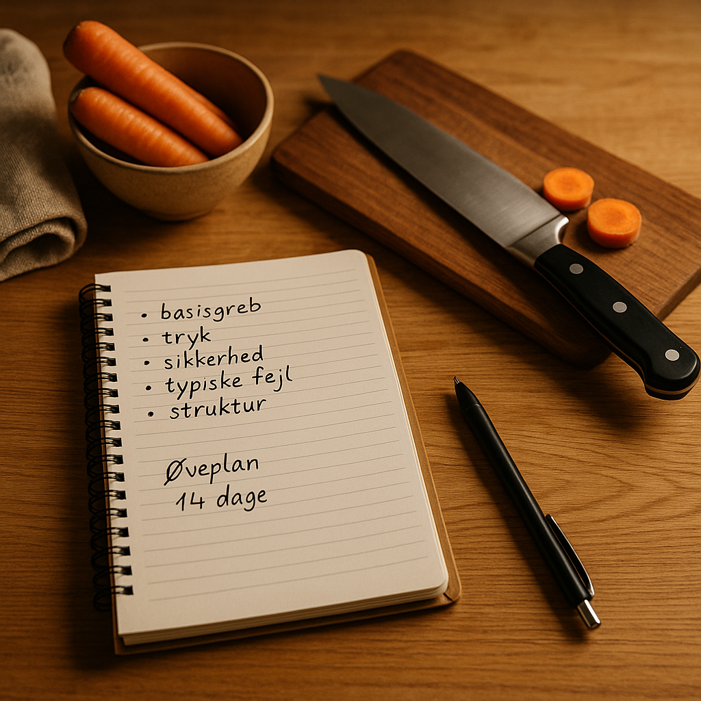 - Dag 3: 10 min: øv ergonomi (bløde knæ, neutral hånd). Skift mellem håndflade og underarm.